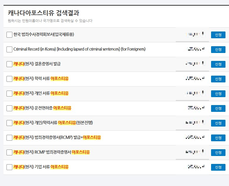 캐나다에서 서류를 발급해서 한국으로 제출하기 위한