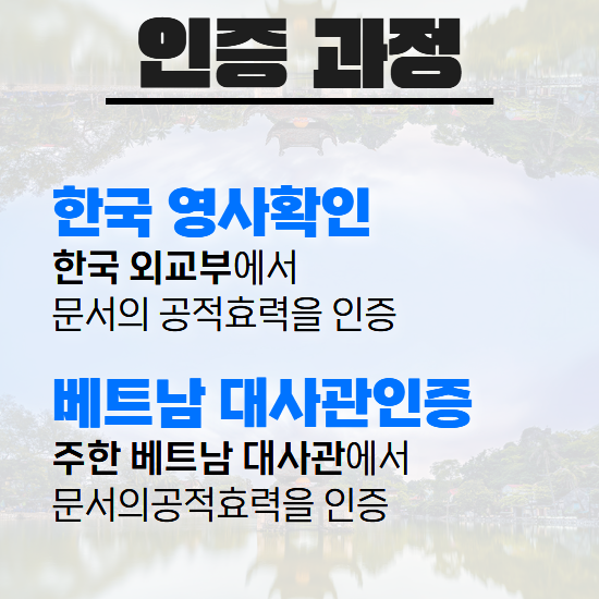 서류를 발급받은 후 신청만 하시면 번역부터 번역 공증, 한국 영사확인, 베트남 대사관 인증까지 한 번에 진행해 드리니 많은 신청 바랍니다.