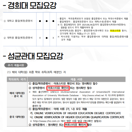 학위증명서를 제출할 때 아포스티유 인증을 받으란 것을 보실 수 있는데요