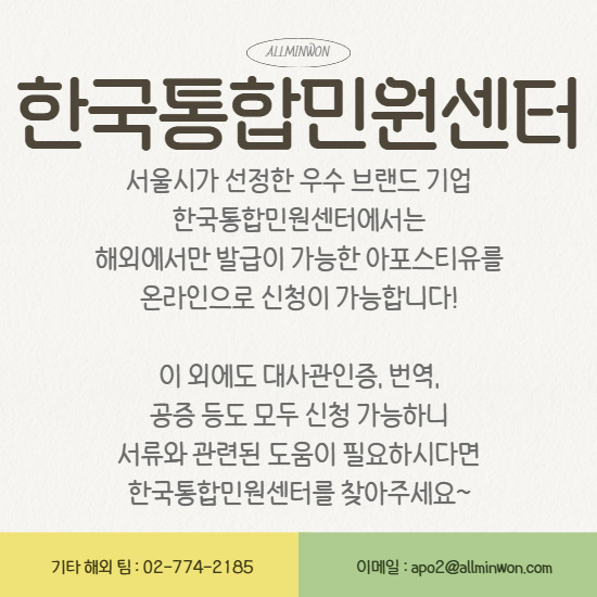 - 특별히 원본 서류 자체에 아포스티유 인증서 부착이 필요하시면 사전에 문의해 주시기 바랍니다