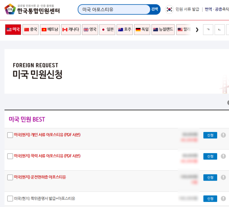 2. [미국 아포스티유] 검색 or 상단의 [미국] 선택