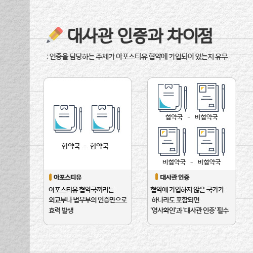 아포스티유 협약국끼리는 외교부나 법무부의 인증만으로 효력이 발생하지만,
