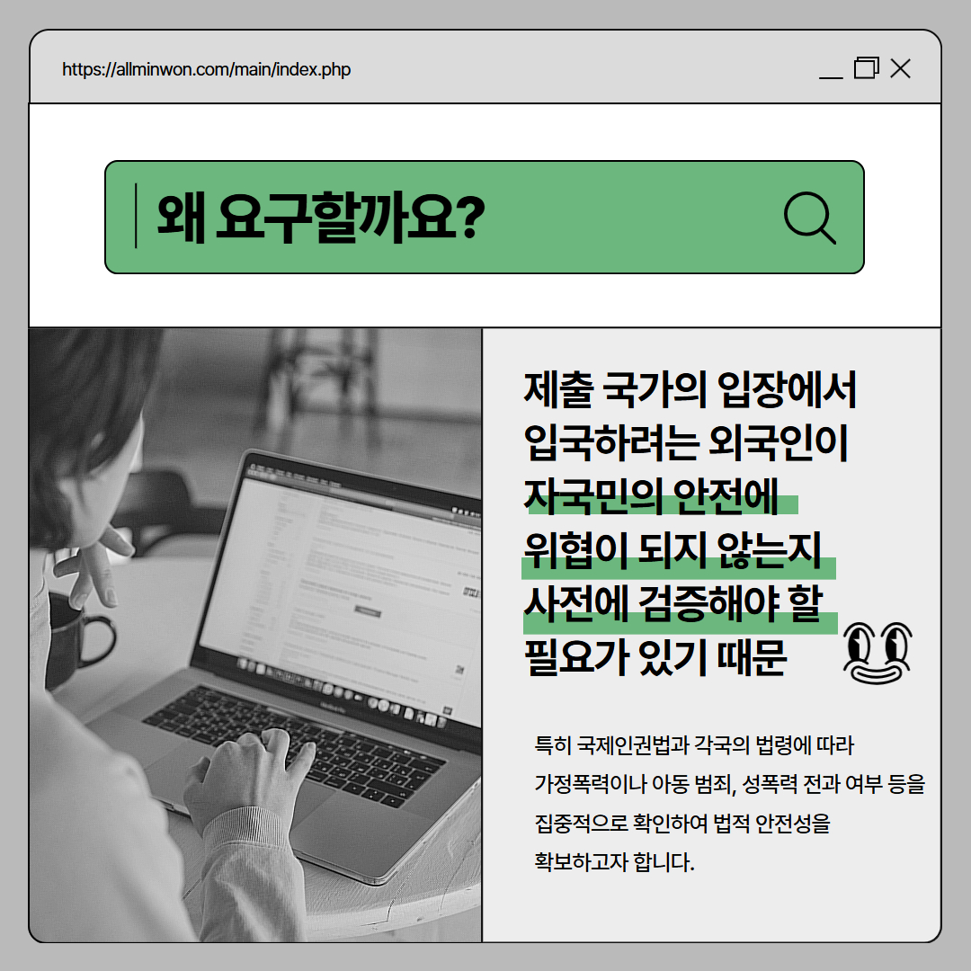 제출 국가의 입장에서 입국하려는 외국인이 자국민의 안전에 위협이 되지 않는지 사전에 검증해야 할 필요가 있기 때문입니다.