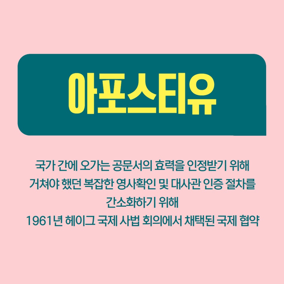 아포스티유란 국가 간에 오가는 공문서의 효력을 인정받기 위해 거쳐야 했던 복잡한 영사확인 및 대사관 인증 절차를 간소화하기 위해